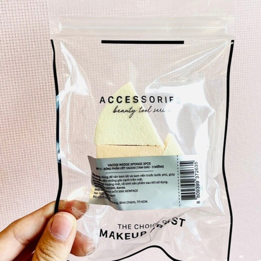 Bông phấn ướt tam giác nhọn VACOSI với cấu tạo bề mặt mút min màng, và bo góc. Giúp bạn thoải mái tán kem nền đều khắp mặt mà không gây đau rát, khó chịu cho da.