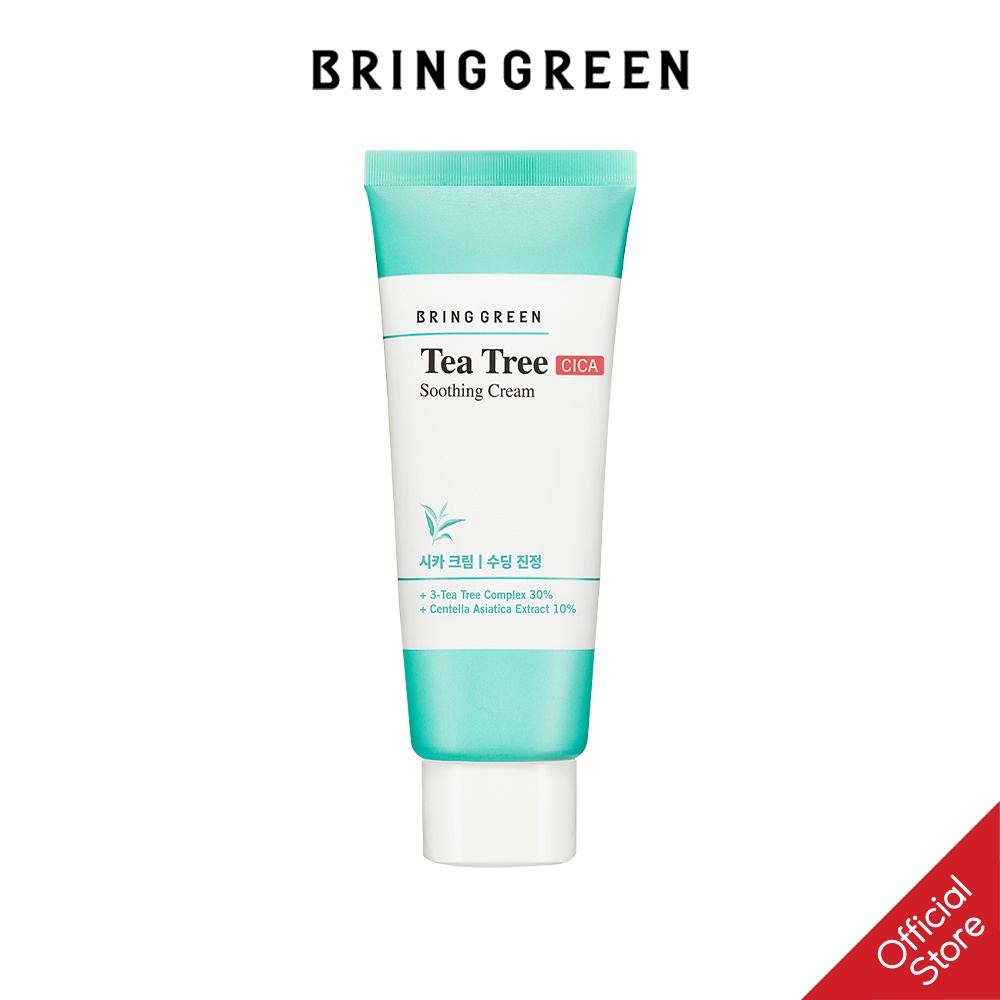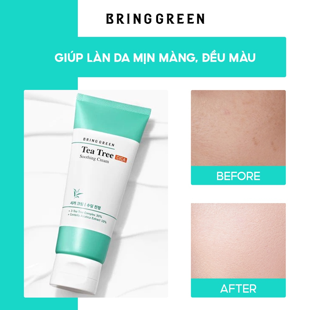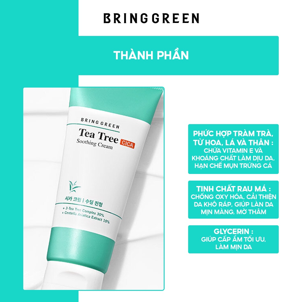Kem dưỡng giảm mụn dịu da tràm trà Bring Green Tea Tree Cica Soothing Cream 100ml - daothinhuquynh giúp làm dịu kích ứng da với kết thúc tươi mát và dưỡng ẩm, giảm sự xuất hiện của sẹo, vết thâm do mụn. Sản phẩm có kết cấu cream mỏng nhẹ, thấm nhanh qua da giúp cân bằng độ ẩm dầu của da, phù hợp với những làn da hỗn hợp, dễ bị mụn, cần chăm sóc da nhẹ nhàng để làm dịu kích ứng và kiểm soát việc tiết quá nhiều bã nhờn.