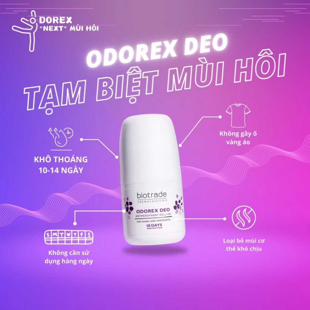 - Công nghệ tiên tiến của Odorex Deo tác động trực tiếp đến các tuyến mồ hôi hoạt động quá mức mà không làm ảnh hưởng đến quá trình điều nhiệt tự nhiên của cơ thể.