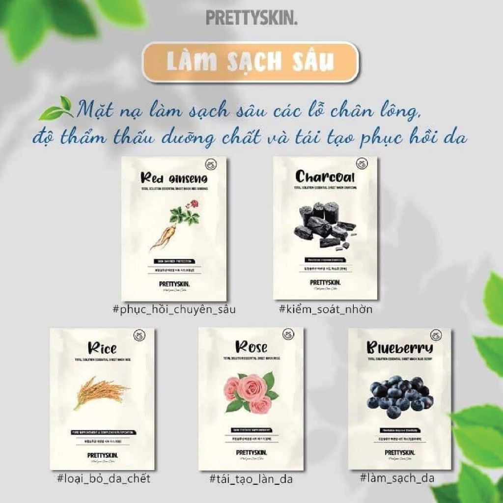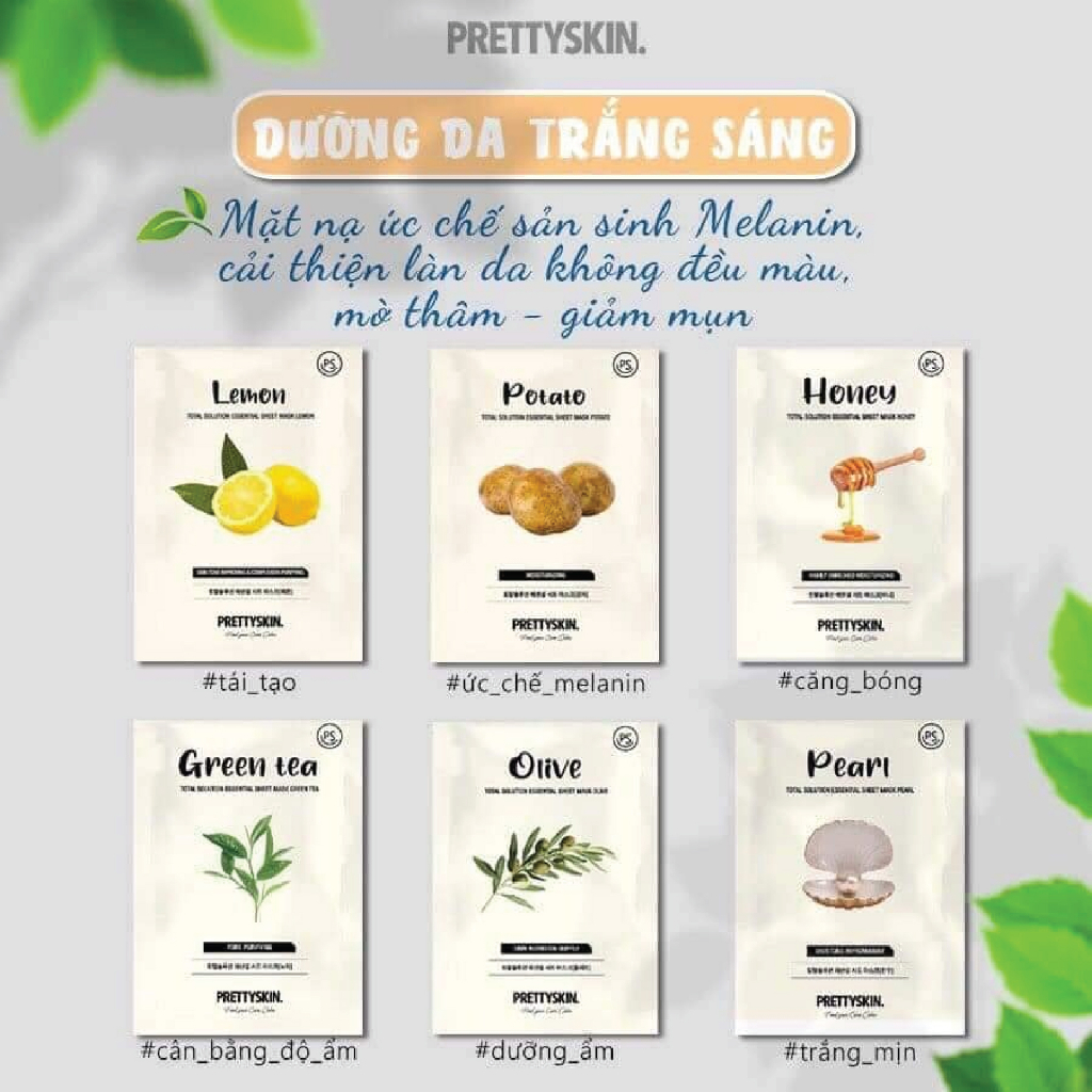 - Mặt Nạ Pretty Skin Total Solution Essential Sheet Mask với thành phần chiết xuất từ hoa quả thiên nhiên, đa dạng.
