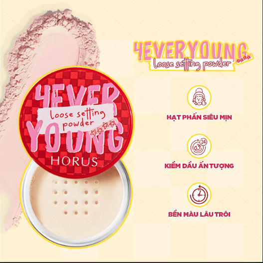Phấn phủ bột Horus 4Everyoung Loose Setting Powder siêu mịn giữ lớp makeup bền màu , lâu trôi 7g là "siêu phẩm" phấn phủ mới ra mắt của nhà HORUS , siêu khóa nền dành cho mùa hè có 2 tone màu chính là Pink và Beige