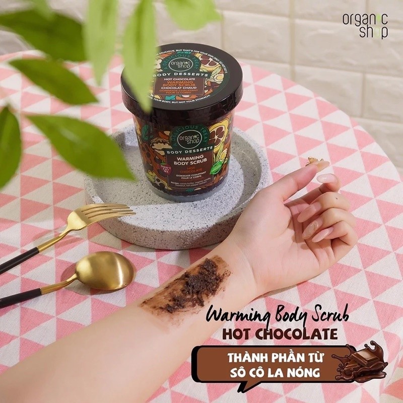 - Tẩy Tế Bào Chết Toàn Thân Organic Shop Hot Chocolate 450ML: Chiết xuất ớt và hạt tiêu giàu Vitamin A nhưng sẽ gây hơi nóng. giúp tăng tuần hoàn máu , và mang lại sức sống mới cho da .