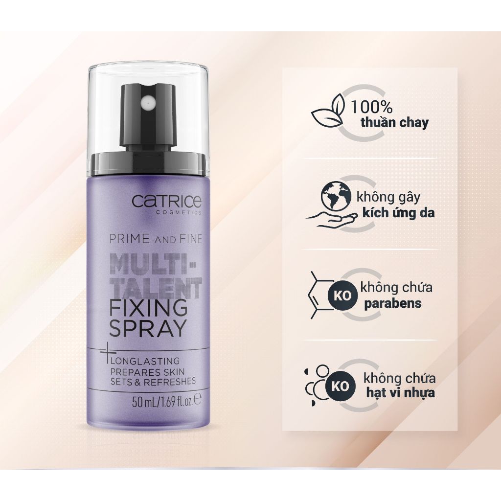 - Xịt khóa nền Catrice với công thức đặc biệt sẽ hạn chế tối đa lượng dầu xuất hiện trên da, giúp bề mặt da mụn đỡ bị sần sùi, lỗ chân lông trở nên thoáng hơn, làn da trở nên mướt và “ăn phấn” hơn rõ rệt.